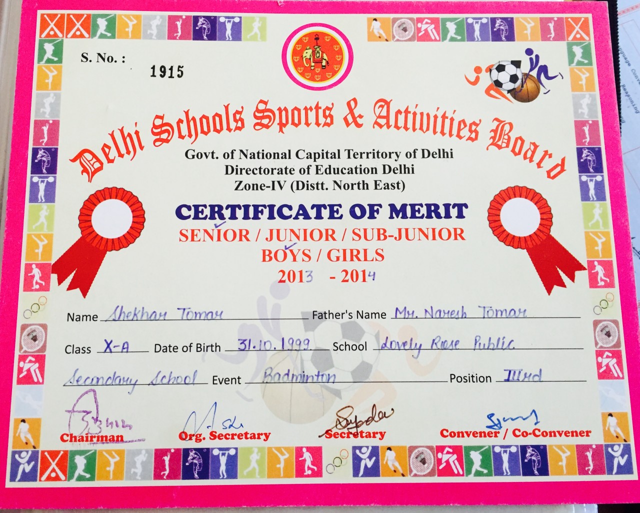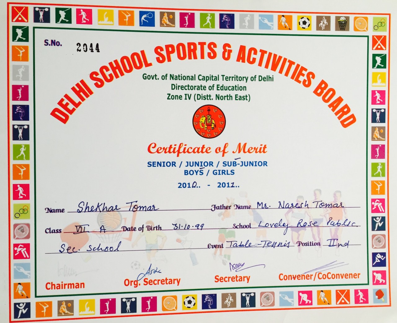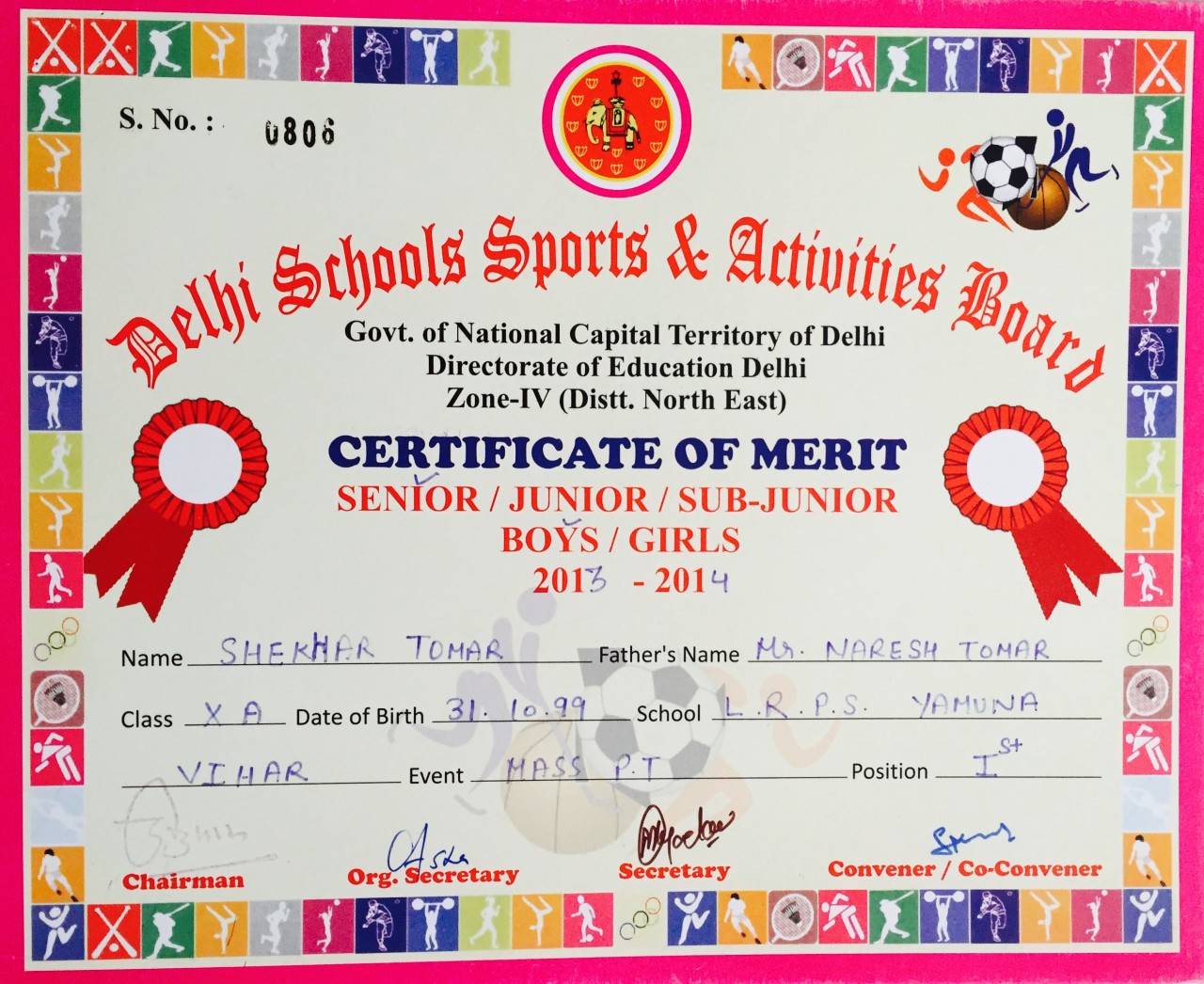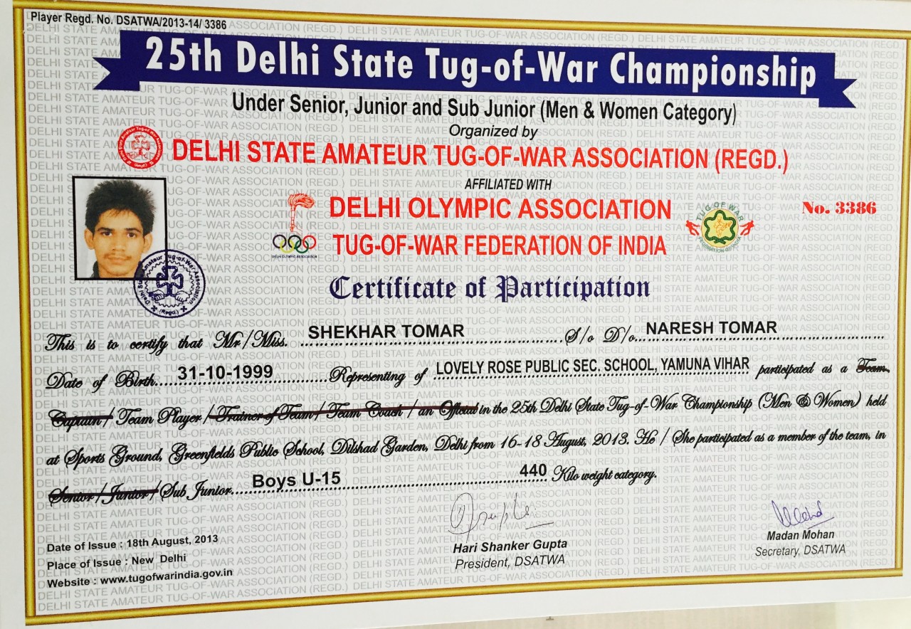CERTIFICATE OF PARTICIPATION IN TUG-OF-WAR IN 25th Delhi State Tug-of-War Championship(Men) held at Sports ground greenfield Public School Dilshad Garden Delhi from 16-18 August,2013. I participated as a member of the team,in sub junior Boys U-15 ...440 kilo weight category.