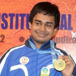 Description : Soumyajit Ghosh won gold in men's team event at the Lusofonia Games-2014 in Goa.